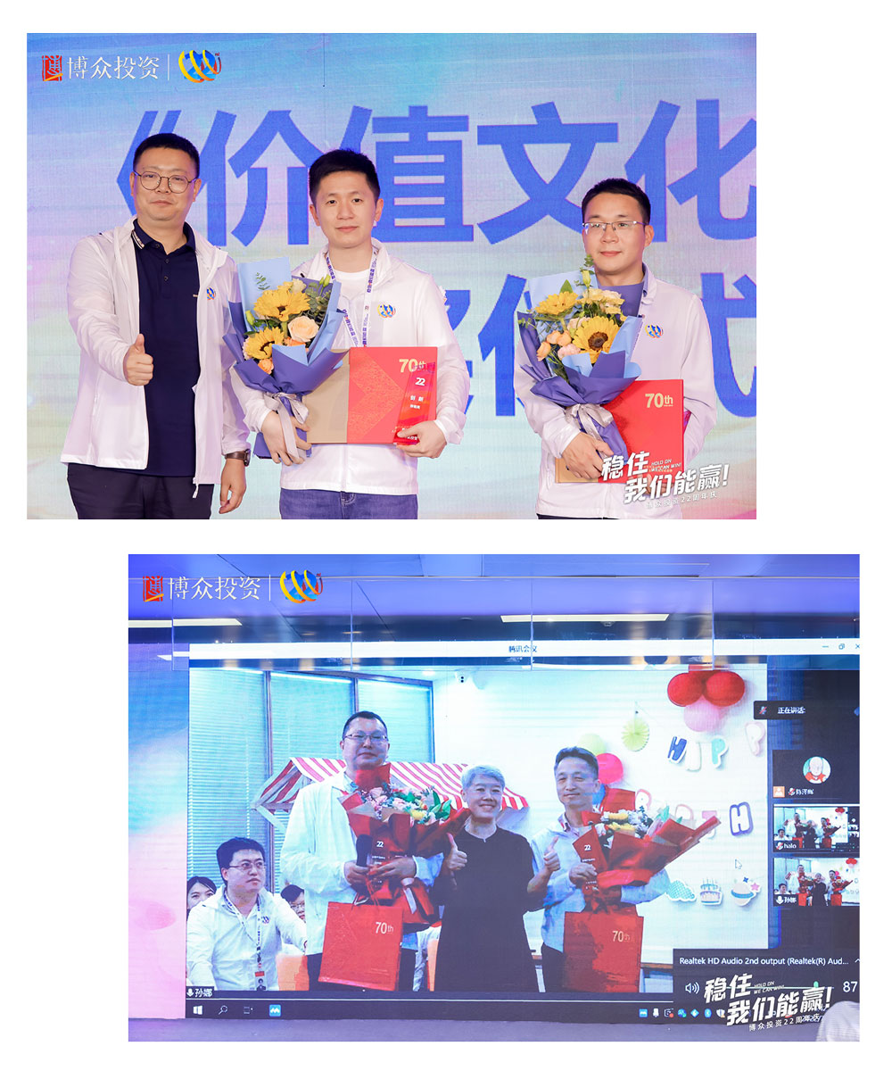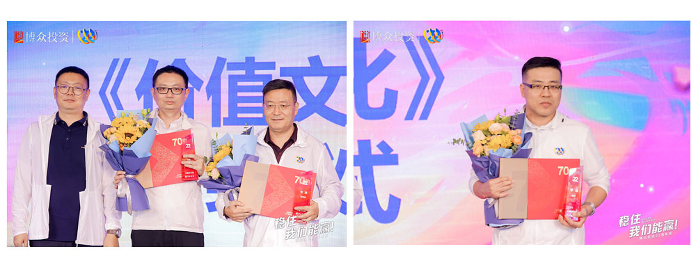 下一項慶典議程是博眾文化頒獎儀式,首先頒發的是“以奮斗者為本”獎。榮獲此項榮譽的團隊,是由朱艷湘率領的行政部。緊接著,頒發的是“本分”獎,榮獲此項殊榮的團隊是柯炎敏率領的合規部。均由鄒總為獲獎團隊頒發榮譽并進行合影留念。